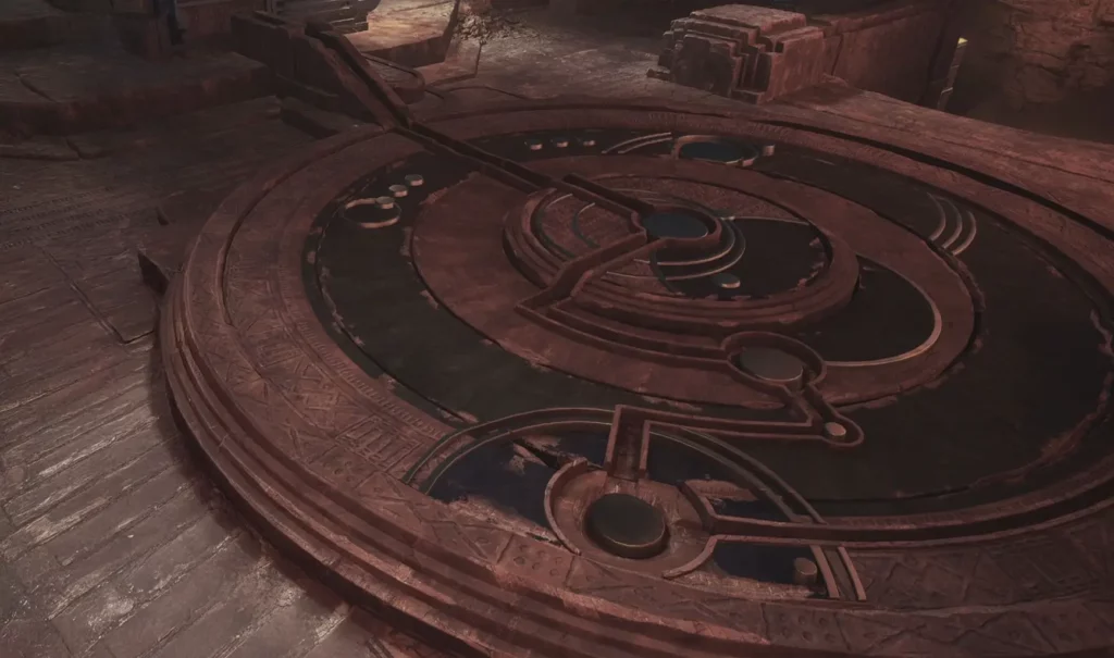 - Mittlerer Ring: Drehe ihn so, dass die eingravierte Rinne vom Tor weg und direkt auf den Altar in der Mitte zeigt.